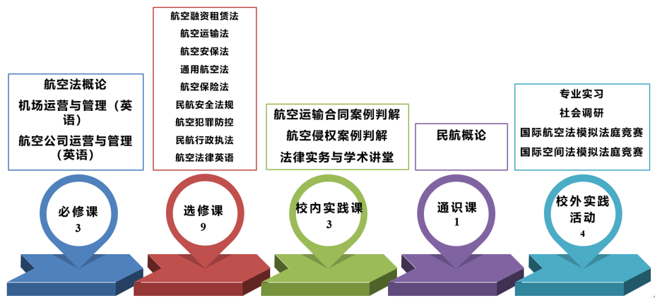 开发校本课程,追求专业特色发展。依托航空法学科研究,结合专业发展目标,自主开发设计“专业+通识、必修+选修、理论+实践”构成的17门特色课程。