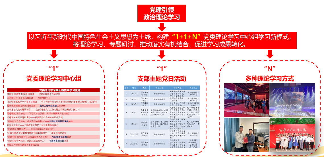 坚持政治领航,全面加强党的领导。以政治建设为统领,加强五讲型领导班子建设和基层党组织建设,一体推进“五风”建设。创新组织模式,把党支部建在科研团队上,引导师生党员共同参与,激发育人功能,深入开展党建品牌建设。落实政治把关制度、健全风险研判机制,牢牢把握意识形态工作领导权。加强师德师风建设,突出教育引导和制度约束并重,引领新时代“四有”好老师队伍建设。构建学院宣传思想文化体系,凝练学院标识、学院精神,建强线上线下阵地,不断提升凝聚力和向心力。学院党委连续在学校基层党组织建设考核中被评定为“好”,领导班子2次被评为优秀“五讲型”领导班子。2名教师被评为民航优秀共产党员,1名教师获评全国民航五四青年奖章,2名教师被学校评为立德树人优秀奖,1名教师被评为学校最美教师,3名学生入选天津市青马学员,2名学生获全国民航优秀共青团员荣誉称号。