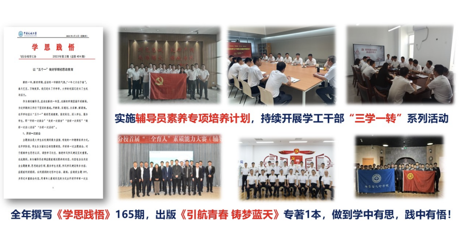 加强队伍建设,培养素质过硬的骨干力量。在学工队伍建设上,开展以“学政治、学管理、学飞行、转作风”为主要内容的“三学一转”活动;在学生干部建设上,突出抓好“选、培、用、考”四个环节,实施“启航成长计划”和“领航驻班计划”;在学生党员队伍建设上,重点组织以“党员宿舍亮旗帜、佩戴党徽亮身份、仪容仪表亮作风”为主要内容的“三亮”行动。学生工作干部中2人获得天津市青年五四奖章荣誉称号、1人获评全国民航优秀团干部、2人荣获中国民航大学“启明星”辅导员荣誉称号、4人获得中国民航大学青年五四奖章荣誉称号;3名学生获评中国民航大学“十佳大学生”。