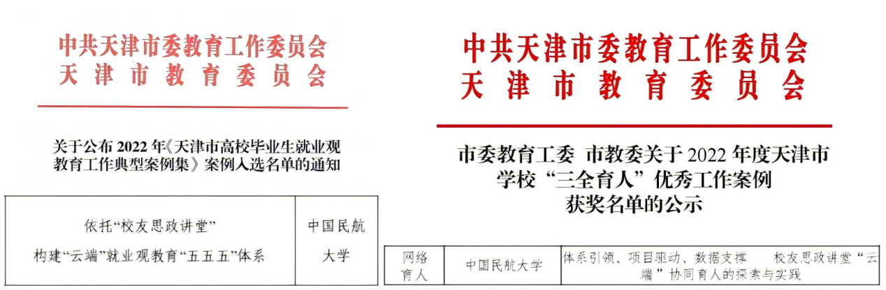 网络思政育人创品牌。学院紧紧围绕“1232”大思政教育教学体系建设,以思政引领为出发点,以网络协同为切入点,以体系构建为根本点,以项目驱动为着力点,以培养质量为落脚点,构建民航特色职业教育网络思政育人体系,打造全员、全过程、全方位协同育人思政品牌。蓝天思政讲堂协同育人品牌,搭建优秀校友与在校生“云端”互动交流平台,创新人才培养模式,提高人才培养质量。截至目前,蓝天思政讲堂已遴选来自航空公司、制造公司、机场集团等60余家单位的80位优秀校友和我校24位教师,共组织蓝天思政讲堂100余场,线上直播观看人数达16878人次,累计阅读浏览量达26798人次。超过46%的学生已经自主培养固定收看讲座的习惯,超过95%的学生认为系列讲座可以给自己带来收获。学院思政育人工作成果,获评天津市高校“三全育人”优秀工作案例、天津市高校实践育人工作创新举措优秀案例,入选《天津市高校毕业生就业观教育工作典型案例集》,荣获天津市高校辅导员工作优秀案例二等奖。