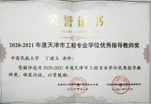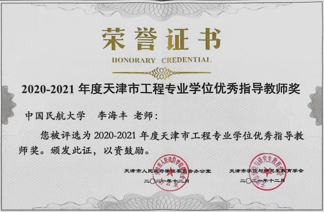 李海丰荣获“天津市向上向善好青年-勤奋上进好青年”荣誉称号;丁建立、李海丰两位老师荣获天津市工程专业学位优秀指导教师奖;王宏伟、顾秋丽分别荣获民航优秀共产党员和民航优秀党务工作者荣誉称号;沈陶老师获评中国民航大学学生最喜爱的教师。