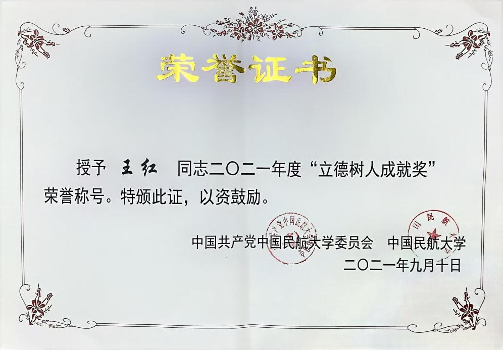 王红荣获中国民航大学首届“立德树人成就奖。自1987年入职以来,她始终坚守在本科教学一线从事计算机基础课程的教学科研工作,担任硕士生导师、本科生导师,并从2002年7月开始负责计算机学院本科教学管理工作。在34年的教学与管理工作中,她遵循“爱心+责任心+全身心投入”的职业本分,数十年如一日,致力于计算机课程体系的建设与改革实践。作为一名教师党员,她坚持认为自我道德修养是做好高校教师的根本,自己崇高的信仰和坚定的信念对学生的影响往往是终身的。她深刻理解了“选择当老师就选择了责任,就要尽到教书育人、立德树人的责任,并把这种责任体现到平凡、普通、细微的教学管理之中”。