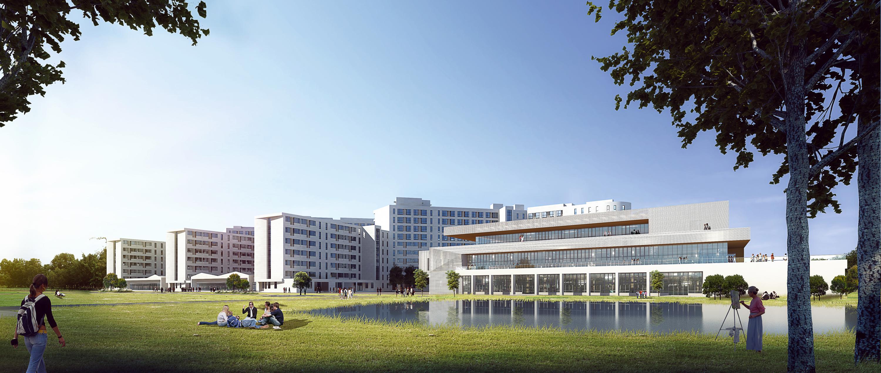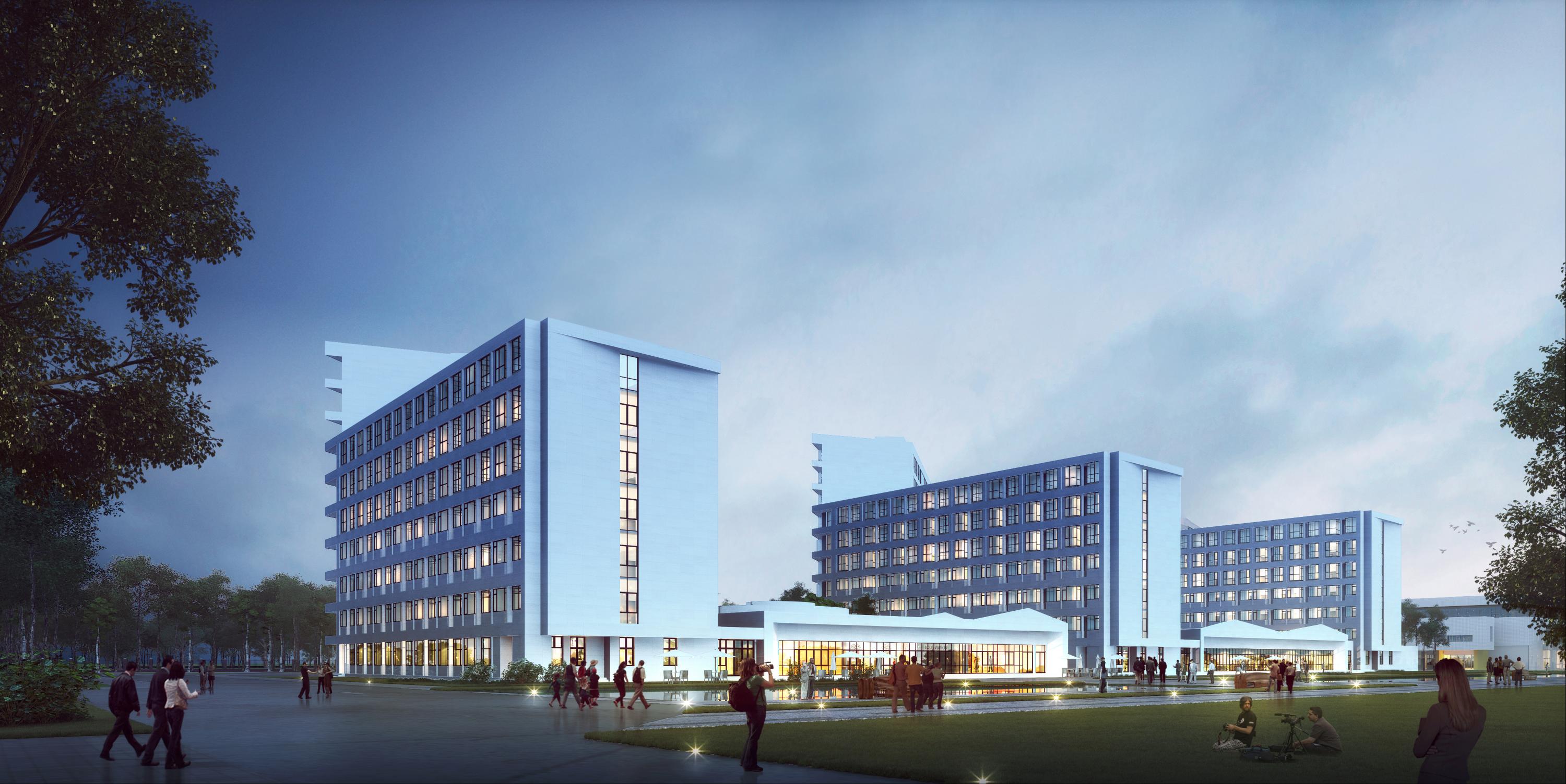 设计理念:学生生活组团宿舍采用多层与高层相结合的规划布局形式,获得更大的公共开放绿化空间。