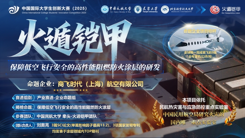 “火遁铠甲”项目作为学校在产业命题赛道的重要突破,由安全科学与工程学院研究生刘奥亮领衔,聚焦动力锂电池热失控防火领域的产业关键需求,创新构建高性能阻燃防火涂层技术体系。其三大核心技术突破实现涂层耐火极限提升至2.0h,背温控制在156.3℃以下。目前该技术已获得“商飞时代”的认可,双方达成深度合作意向,成为学校推动科研教学与产业需求精准对接、促进创新链与人才链有机融合的典型案例,充分彰显了“产学研用”一体化育人模式在服务国家战略与行业发展中的实践成效。