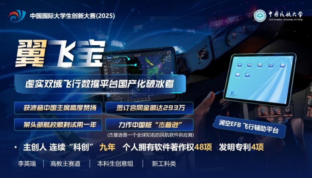 本次夺金的“翼飞宝”项目,由工程技术训练中心吴恩铭教师团队指导,空中交通管理学院学生李英瑞负责。该项目瞄准民航领域关键技术,成功研发出国内首款打破国外垄断的飞行数据平台,构建了贯通“仿真训练-通航航校-民航企业”的全链条EFB生态体系。李英瑞在获奖后激动地表示:“这块金牌见证了团队九年来将编程热爱融入蓝天梦想的坚守。‘翼飞宝'致力于让飞行更安全、更高效,这只是一个新的起点。”