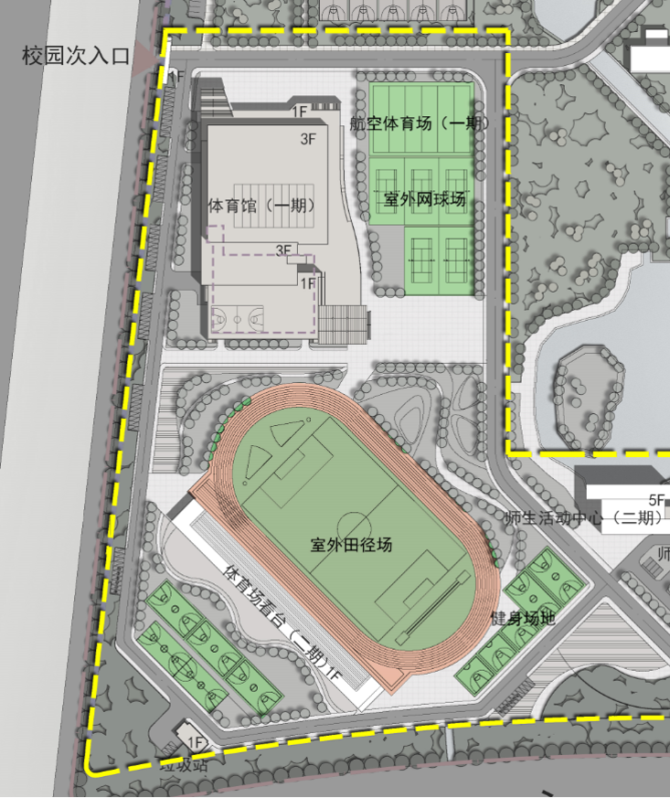室外运动场地包含 5个全场篮球场,4个半场篮球场,3个排球场,5个网球场,一个航空体育场,一个标准足球场,以及1个400米标准田径运动场。