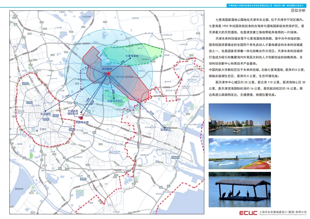 中国民航大学宁河校区位于天津市宁河区未来科技城,产业大道以南、七里海大道以东、永定新河北路以北、次干路十三以西。总用地面积84.9万平方米,地下建筑面积1.5万平方米。一期工程按照满足师生教学、科研、生活、体育锻炼、文化交流等功能需求,共划分四个组团,分别是图书馆组团、体育馆组团、教学区组团和生活区组团,可容纳学生人数约5260人。