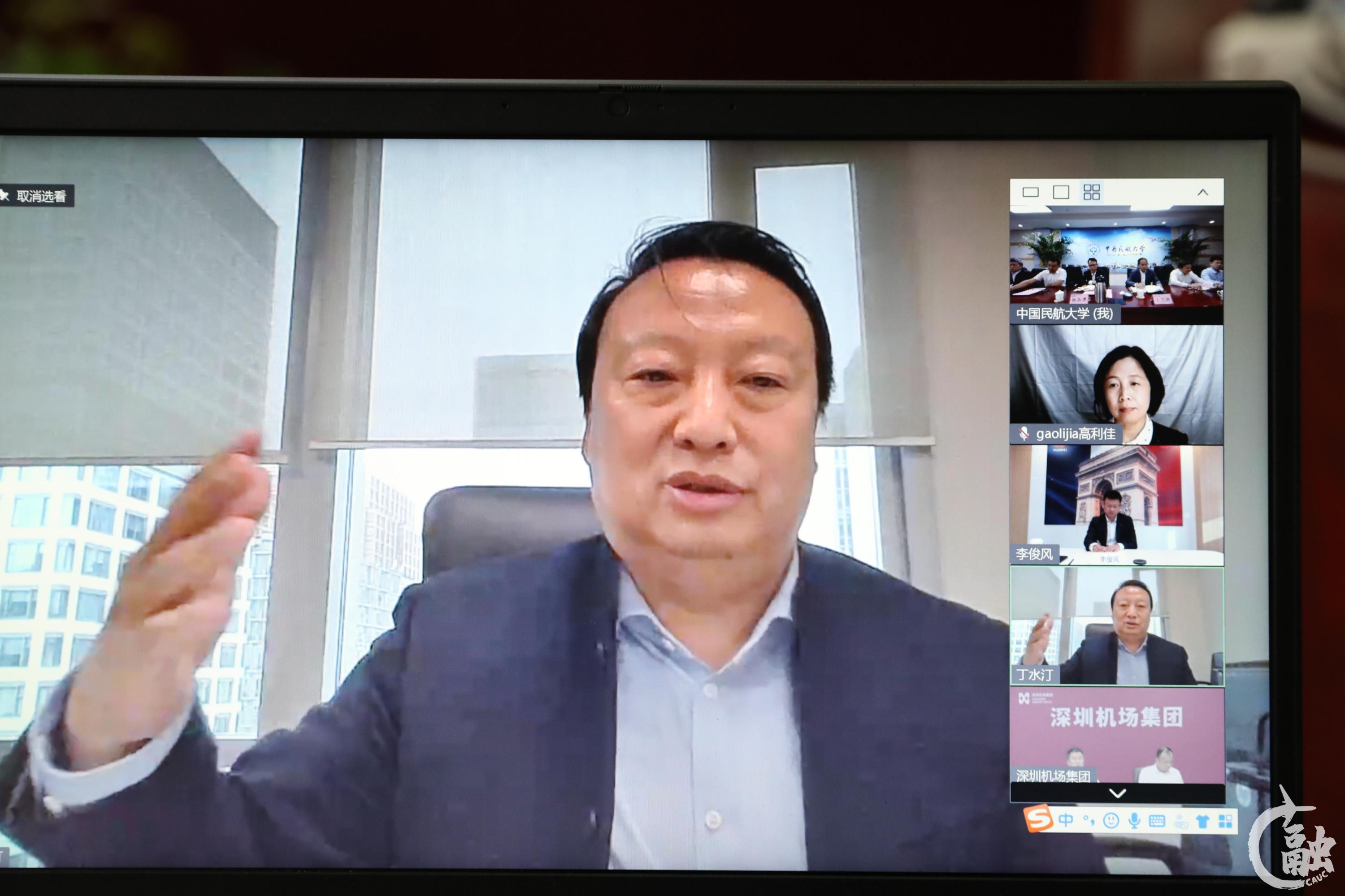 4月27日,深圳市机场(集团)有限公司(简称深圳机场集团)、华为技术有限公司(简称华为公司)、中国民航大学合作协议签约仪式顺利召开,为落实各地防疫要求,本次签约仪式以线上线下结合的方式进行。深圳机场集团董事长陈金祖、华为机场与轨道军团总裁李俊风、中国民航大学校长丁水汀做会议致辞;深圳机场集团副总经理林小龙、华为机场与轨道军团副总裁王国钰、中国民航大学副校长杨新湦签署协议;中国民航大学党委常委王志强主持会议、四型机场研究院院长高利佳做三方合作计划介绍。