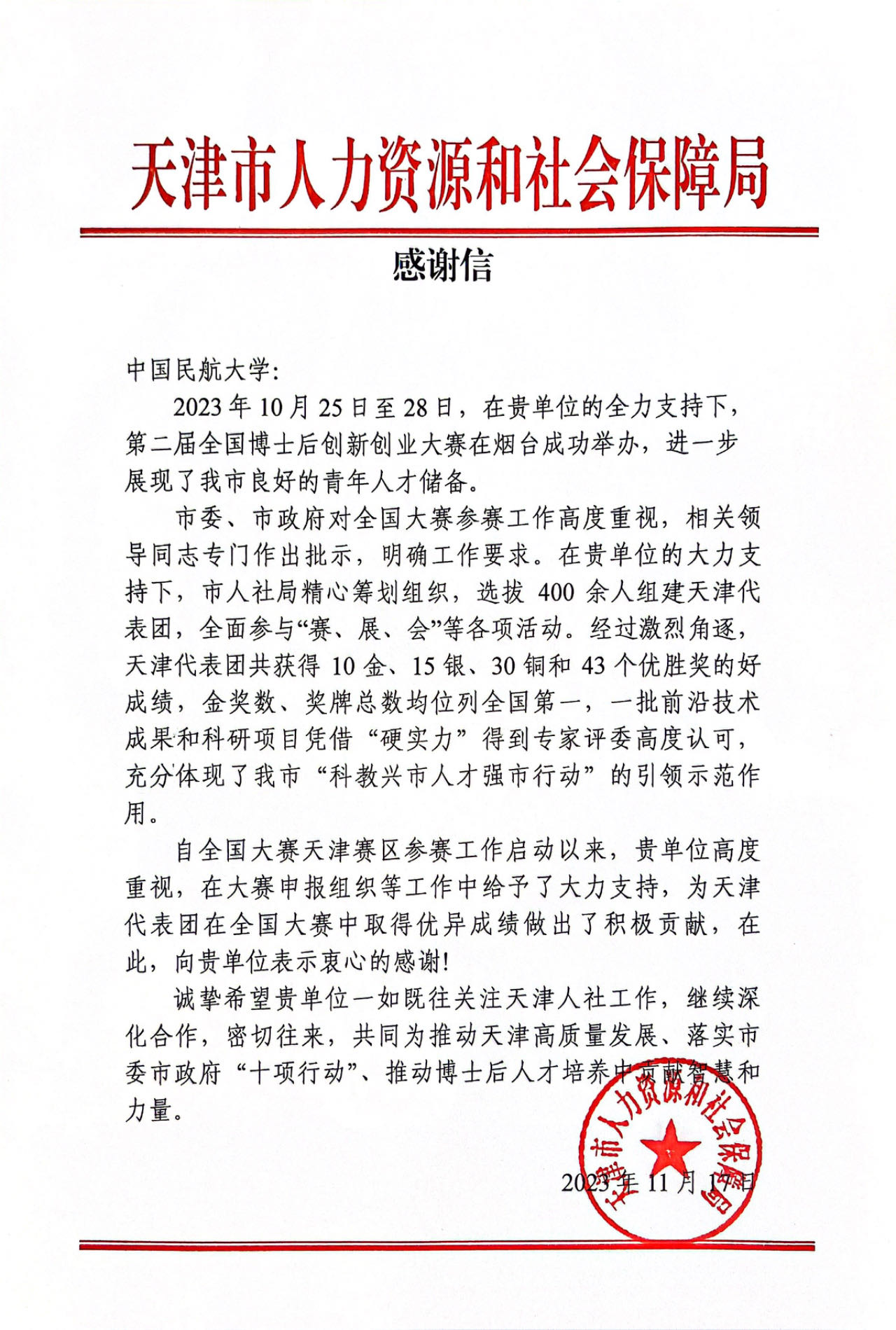 日前,中国民航大学收到天津市人力资源和社会保障局发来的感谢信,感谢中国民航大学对第二届全国博士后创新创业大赛天津代表团的大力支持。