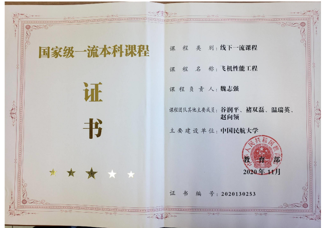 近五年来,核心课程《飞机性能工程》获批首批国家级一流(线下)本科课程,团队荣获中国民航教学成果二等奖1项,中国民航大学教学成果一等奖2项;同时团队主要成员还获得中国航空运输协会科技一等奖、二等奖各1项。