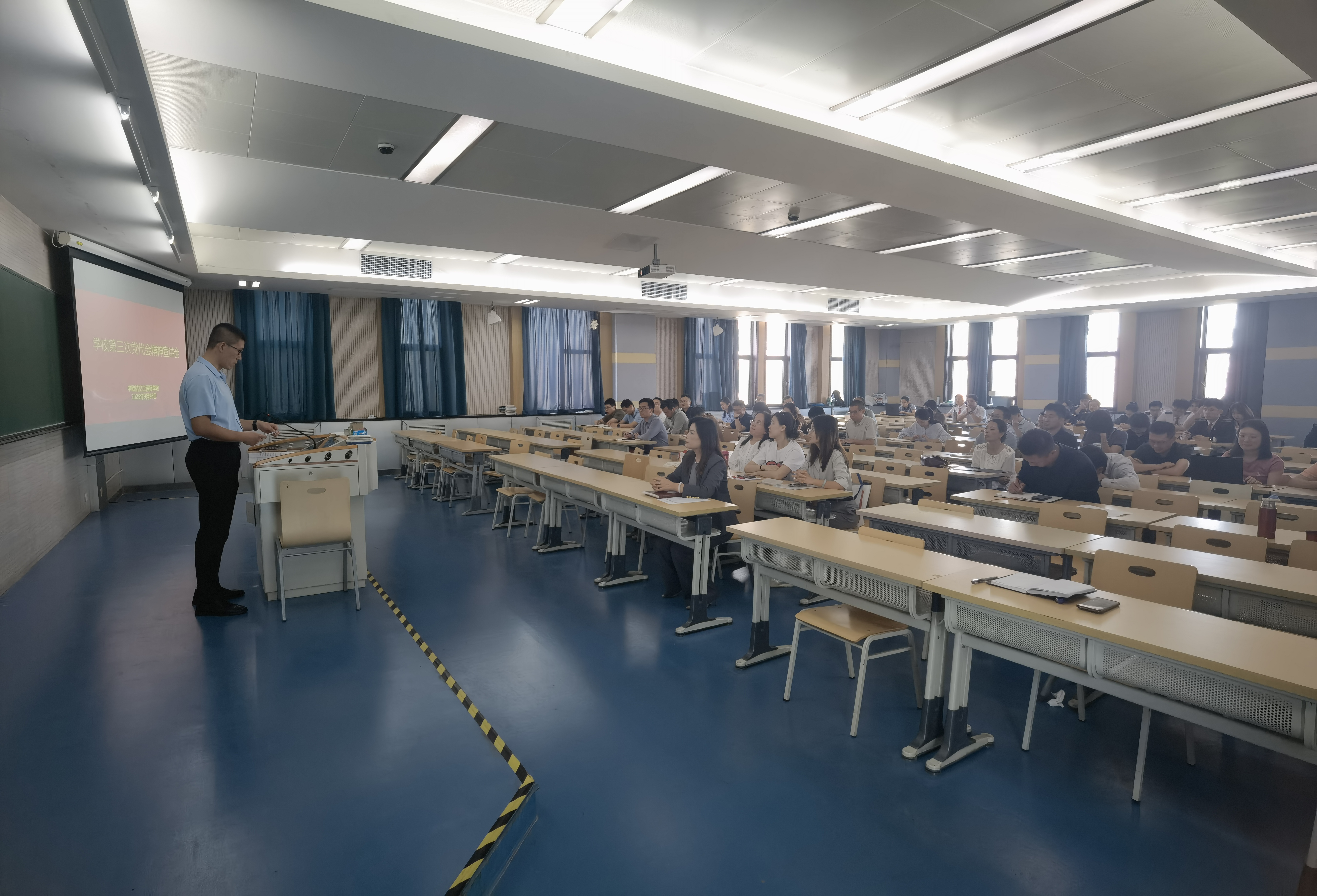 为深入学习贯彻学校第三次党代会精神,凝聚建设中国特色世界一流民航大学的强大合力,9月26日,中欧航空工程师学院召开学校第三次党代会精神专题宣讲会。校宣讲团成员、中欧学院党委书记担任主讲人,党办校办副主任主持会议,学院全体教职工及学生党员全程参会。