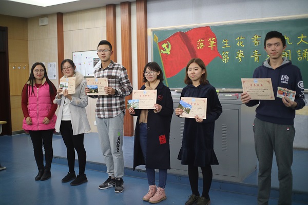 经过激烈的角逐和嘉宾评委公正评分后,7号选手张元珊荣获一等奖,3号选手隋宇航和5号选手马天艺荣获二等奖,1号选手唐俊和6号选手赵芸荣获三等奖,文学社主席都美晔和奕辞社副主席欧阳俊杰为5五位选手颁奖。