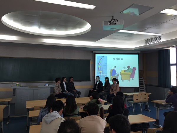 随后,老师随机让三位同学作为面试官代表某活跃在东南5省的航空公司,三位同学作为面试者分别应聘销售、市场营销、机务三个不同岗位,现场为同学们上演了一场“职来职往”。面试官的问题从自我简介切入,逐步从高效率学习方式和核心竞争力等话题展开,到最后的工作地点和薪资待遇。三位面试者从容面对,应答如流,巧妙机智地将实习经历和校园活动等优势融入到回答之中,同学们在场下也是连连称赞。