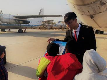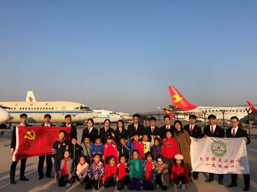 随后,大家来到中国民航大学停机坪切实地感受真正的大飞机是什么样子的。在工程训练中心老师的耐心讲解下,大家学到了很多关于飞机的“小知识”,了解到了飞机的发展历程,并近距离见识到了飞机的起飞和降落。大学生们不仅向他们讲述每架飞机背后的故事,同时也向他们表达了殷切的期望。“希望你们以后也好好学习,长大后和哥哥姐姐一起建设我们的祖国!”