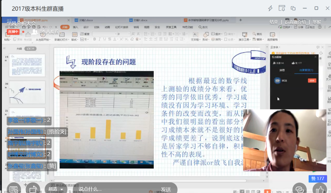 2020年4月12日15点,2017级通过钉钉线上直播平台进行学风分析大会。本次会议主要分析了上学期学习成绩及本学期网上教学情况。本次学风分析会邀请了班导师、任课教师、辅导员参加。