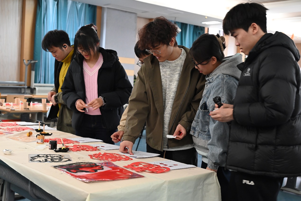 在唐代蒸青茶饼分区,茶香袅袅,同学们学习古法制茶的精髓;兔儿爷·京华童趣分区则充满了欢声笑语,彩绘泥塑唤醒老北京的童年记忆;指尖穿梭于经纬之间,宋锦发夹·寸锦寸心分区让同学们感叹“寸锦寸金”的匠心;螺钿·贝光流彩分区,贝壳碎片在巧手下绽放华彩;针刺无骨花灯·纸间灯火前,光影透过针孔,诉说静谧的浪漫;而在剪纸·镂空万象区,红纸翻飞,万象生灵在镂空中诞生。