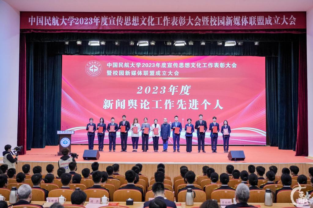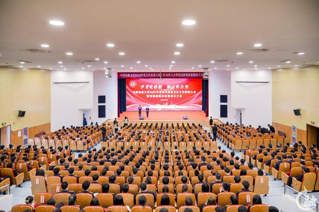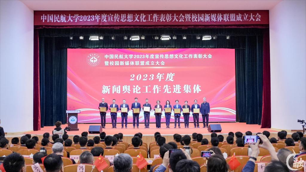 本网讯 3月15日下午,中国民航大学2023年度宣传思想文化工作表彰大会暨校园新媒体联盟成立大会在东丽校区北区礼堂召开。大会高举习近平文化思想旗帜,推动学校宣传思想文化工作展现新气象,凝聚奋进新征程的强大精神合力。中国民航大学党委书记曹胜利出席大会并讲话,他指出,要毫不动摇坚持以习近平文化思想为引领,在新的历史起点上担负起新的文化使命,展现新气象新作为。天津市委教育工作委员会、天津市教育委员会宣传处副处长胡洪,《光明日报》天津记者站站长、高级记者董山峰,新华社记者王晖,人民网记者崔新耀,《光明日报》天津站办公室主任朱斌应邀参加大会,中国民航大学党委常委、科技创新研究院党委书记、统战部部长葛维建出席大会。