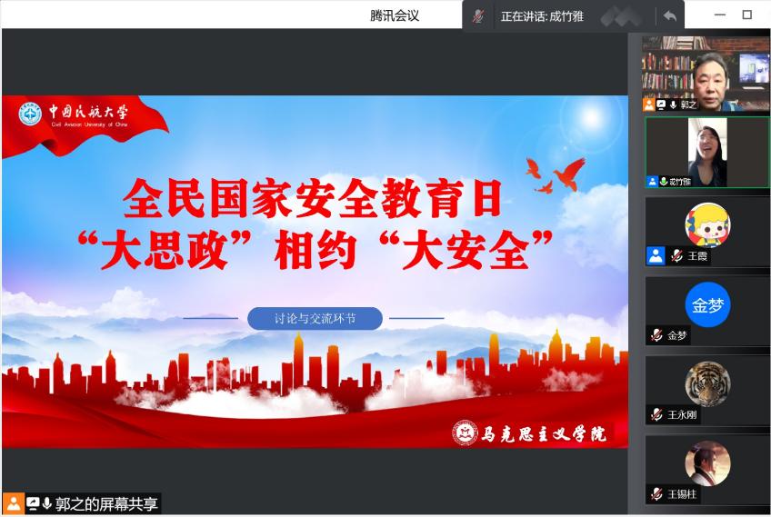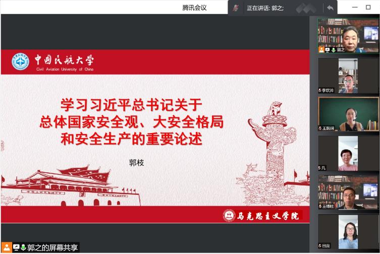 为深刻认识习近平总书记关于大学生思想政治教育的一系列重要思想,践行习近平总书记的总体国家安全观,构建大安全格局,贯彻学校党委构建“三全育人”体系的战略布局,促进教师牢固树立系统安全观念、航空运行绝对安全理念,促进思政教师和专业教师更为积极地投入到“大思政”建设, 4月15日下午,马克思主义学院基础教研室党支部联合安全科学与工程学院安全与应急管理系教工党支部开展了全民国家安全教育日话“大安全”,跨界破圈建构“大思政”集体备课活动。这也是两党支部的党日活动。两党支部全体教师党员“手拉手”,以线上方式参加会议。备课会首先由安全与应急管理系教工党支部书记王霞老师领学了习近平总书记关于大学生思想政治工作的一系列重要论述,继而由基础教研室党支部郭枝老师领学了习近平总书记关于总体国家安全观和安全生产、航空安全的一系列重要论述和指示,然后进入到精彩的报告与交流讨论环节,大家普遍感到这次备课会党建氛围厚重,思政味道浓重,安全意识凝重。会议持续4小时,老师们久久不愿散去。