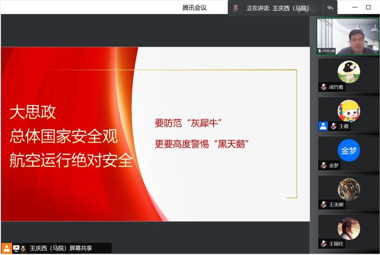 马克思主义学院副院长王庆西饶有兴趣地给大家介绍了民航局局长冯正霖的“牛鹅之喻”,我们要不断拓展对航空安全知识的认知边界,加强对航空安全风险的实时监测、预警与辅助决策技术方面的基础研究,真正做到既要防范“灰犀牛”,更要高度警惕“黑天鹅”,努力用大概率思维防范小概率事件,牢牢守住不发生系统性风险的底线。这对于民航专业育人及思政育人都提出了更高的要求。马克思主义学院金梦老师在报告中指出,我们要吸取民航史上飞行事故的教训,“安全是最大的政治”,在民航人才培养中注重学生系统思维的养成,立足民航,胸怀国家,以大安全观为引导,树立民航安全意识,努力实现民航持续安全;民航教育应强化底线思维,居安思危,从思想动态、心理调节、行业认知、专业技能、实践领悟等各方面增强教师、学生防范化解各种风险挑战的能力。