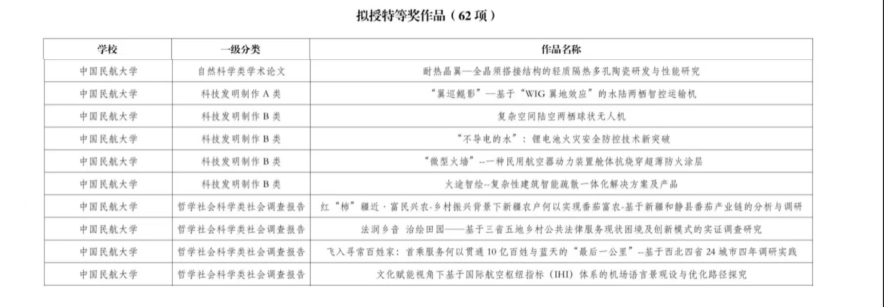 获天津市特等奖的作品分别有理学院王明超、航空工程学院刘兵飞和刘洪丽指导的《耐热晶翼-全晶须搭接结构的轻质隔热多孔陶瓷研发与性能研究》,空中交通管理学院遇炳昕、航空工程学院武耀罡和马超指导的《“翼巡鲲影”一基于“WIG翼地效应”的水陆两栖智控运输机》,航空工程学院马超指导的《复杂空间陆空两栖球状无人机》,科创院李秀涛、周晓猛指导的《“不导电的水”:锂电池火灾安全防控技术新突破》,安全科学与工程学院张海军、理学院王明超、科创院郭一博共同指导的《“微型火墙”--一种民用航空器动力装置舱体抗烧穿超薄防火涂层》,工程技术训练中心程争和张晓敏、电子信息与自动化赵翔宇指导的《火途智绘--复杂性建筑智能疏散一体化解决方案及产品》,安全科学与工程学院李泰安、梁菀琳指导的《红“柿”疆近·富民兴农-乡村振兴背景下新疆农户何以实现番茄富农-基于新疆和静县番茄产业链的分析与调研》,马克思主义学院包姝妹、中航大公司丁亚楠联合天津市蓟州区桑梓镇网格中心李景芝指导的《法润乡音治绘田园--基于三省五地乡村公共法律服务现状困境及创新模式的实证调查研究》,经济与管理学院赵桂红、许天牧、王悦颐指导的《飞入寻常百姓家:首乘服务何以贯通10亿百姓与蓝天的“最后一公里”--基于西北四省24城市四年调研实践》,外国语学院吴云涛联合合肥新桥国际机场王丽霞共同指导的《文化赋能视角下基于国际航空枢纽指标(IHI)体系的机场语言景观设与优化路径探究》,其中耐热晶翼、翼巡鲲影、不导电的水、微型火墙、红“柿”疆近、飞入寻常百姓家6件作品被推荐参加全国赛。