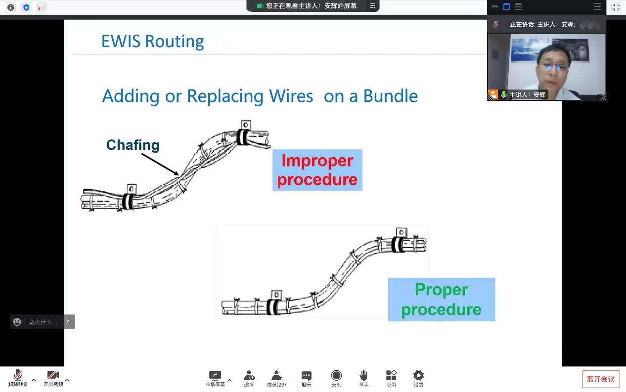 5月10日下午,在国际处积极协调和指导下,图书馆邀请波音驻场工程师安辉先生举办了电气导线互联系统(EWIS)主题线上学术讲座。本次讲座作为工程训练中心实践课的一部分,针对师生需求确定讲座内容,由工训中心黄复清老师带领部分学生在图书馆民航飞机特藏室聆听了本场讲座,另有部分相关专业师生线上参加。
