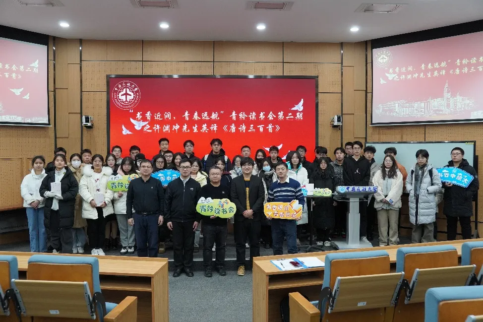 12月15日下午,由校工会、外国语学院工会、青年工作委员会联合开展的“书香近润﹒青春远航”青衿读书会第二期活动在北教14-S125教室圆满举办,本期邀请到了我校外国语学院英语系主任刘晓峰老师围绕著名翻译家许渊冲先生的英译《唐诗三百首》进行分享。校工会领导、青委会委员、青年教师代表以及来自外国语学院、航空工程学院的学生代表前来参加活动,青年工作委员会委员、电子信息与自动化学院王鹏老师主持此次读书分享会。