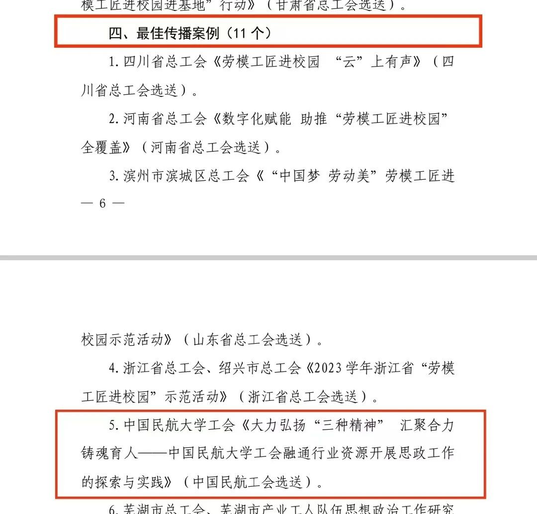 其中,中国民航大学工会报送的《大力弘扬“三种精神”汇聚合力铸魂育人——中国民航大学工会融通行业资源开展思政工作的探索与实践》获“最佳传播案例”。