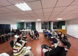 “鼓圈”活动是由人和鼓组成的圈,是即兴团体演奏形式,可作为音乐治疗的一种形式。参与同学集体即兴演奏,感受当下内心真实的自我,提升心灵境界,借助艺术的力量发挥疏解情绪、疗愈心灵的作用。