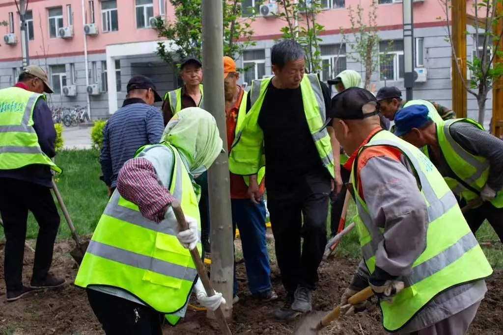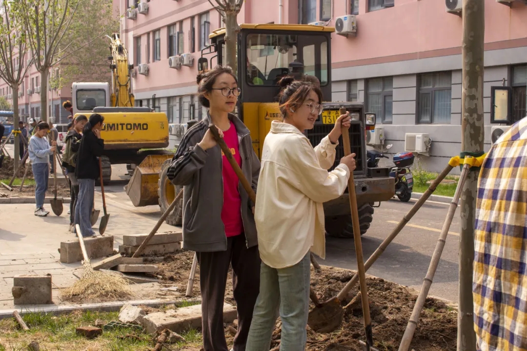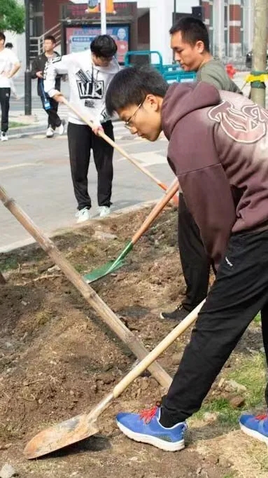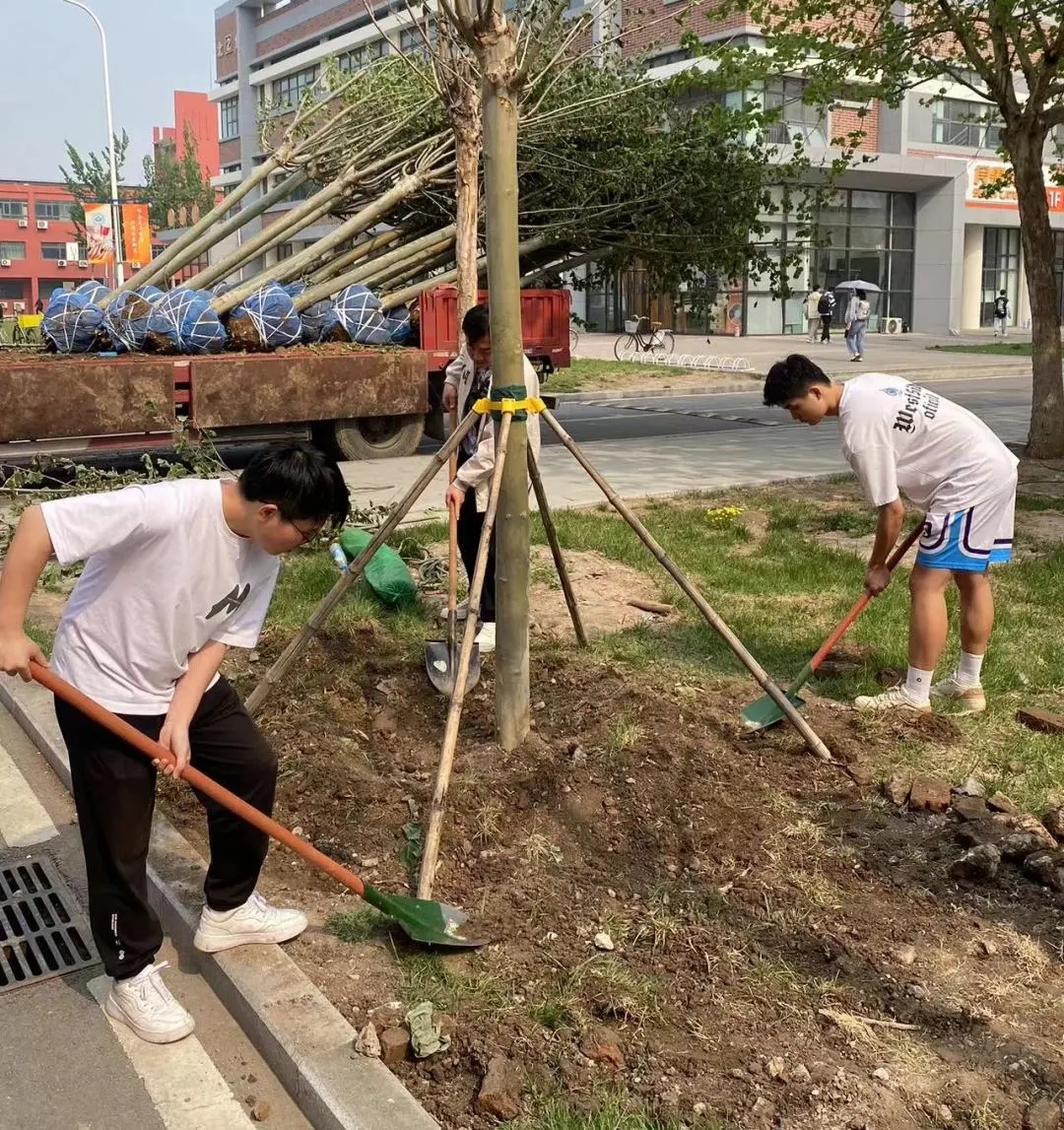同学们干劲儿十足,挥锹铲土,为一棵棵树苗填实土壤。