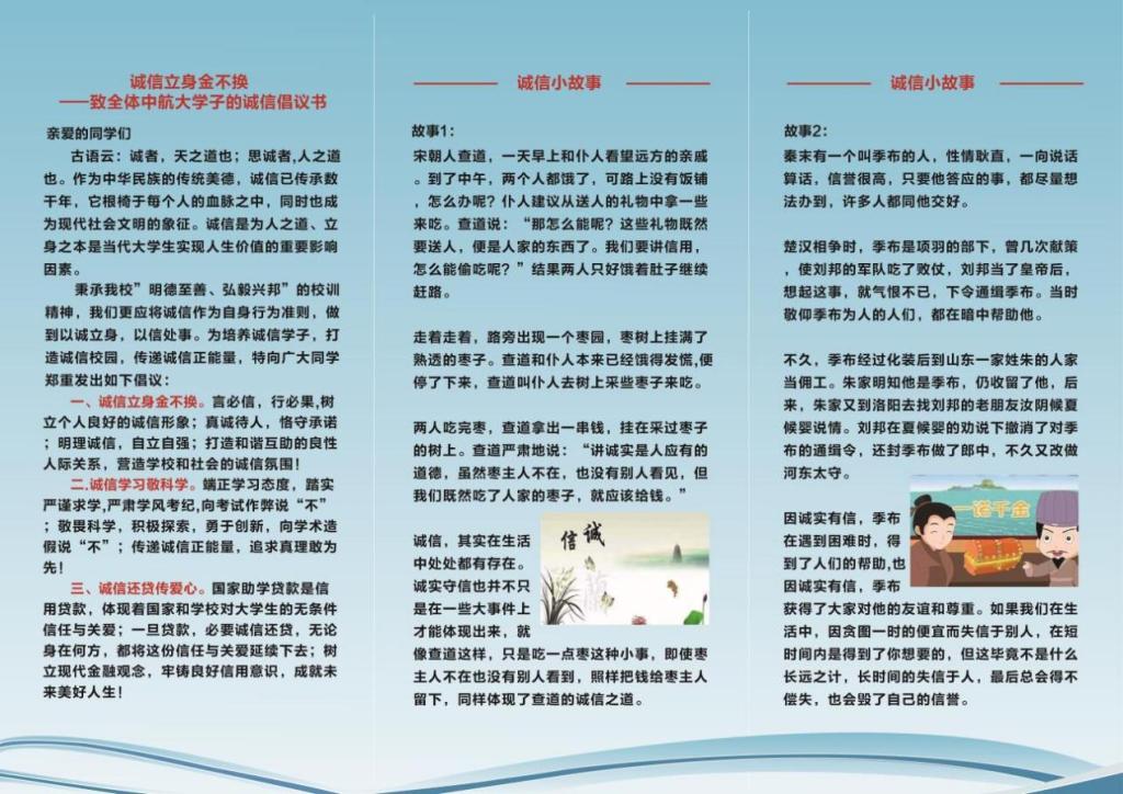 诚信主题宣传折页创作活动。开展学生诚信教育的同时,为进一步为培养学生诚信待人、诚信处事、诚信学习、诚信立身的品质,营造诚信、感恩、励志的校园文化氛围,我校资助中心围绕“家庭经济困难生认定、助学贷款申请、资助项目申报、学习考试、日常生活等”与学生息息相关的内容开展资助主题宣传折页创作活动,引导学生深入挖掘诚信文化内涵,以宣传折页为载体传播诚信文化与感恩意识,强化资助工作的育人成效。此次活动以学院为单位提交宣传折页作品,共提交作品20余篇,经校级选拔后,评选出优秀宣传折页5篇。