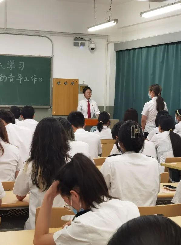 团委组织部部长陈晓首先将《论党的青年工作》的内容进行了简要介绍,后又结合了习近平总书记的其它谈话记录和重要文稿阐释了党对青年工作的一系列重要论述,传达了共青团建设要达到的“坚持为党育人、自觉担当尽责、心系广大青年、勇于自我革命”等四大要求。主讲人陈晓以抗日年月的青年英烈和如今抗疫一线的青年主力军为例,号召团学骨干铭记历史、走好今路,做到爱国、励志、求真、力行,带领身边的青年不断书写奉献青春的时代篇章。参会同学认真记录、热烈讨论。