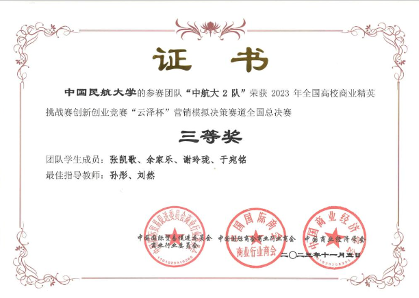 热烈祝贺中国民航大学经济与管理学院3支队伍在2023年全国高校商业精英挑战赛创新创业竞赛全国总决赛中分别斩获“云泽杯”营销模拟赛道全国总决赛一等奖、二等奖、三等奖。