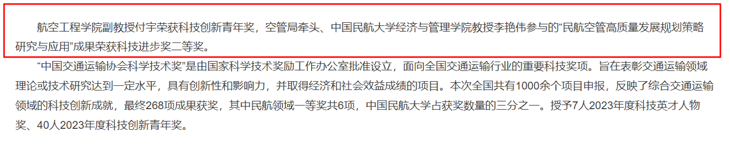 空管局牵头、中国民航大学经济与管理学院教授李艳伟参与的“民航空管高质量发展规划策略研究与应用”成果荣获科技进步奖二等奖。