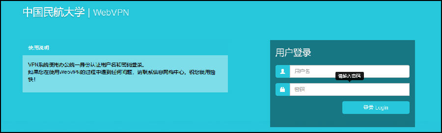 ②自动跳转至中国民航大学VPN身份验证界面,输入我校上网(办公自动化)账号、密码,点击登录;