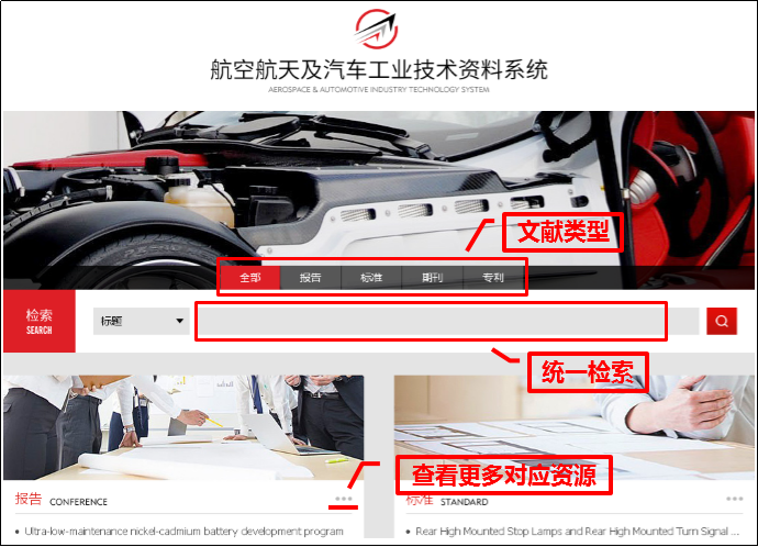 2. 进入《航空航天及汽车工业技术资料系统》主页,可以进行不同文献类型的检索,以及查看更多对应的文献资源。
