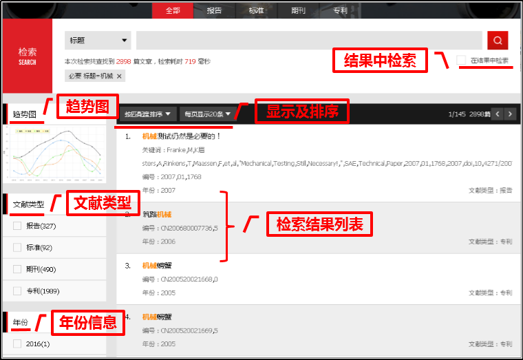 3. 可通过趋势图查看检索结果,还可以对检索结果进行二次检索。