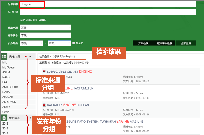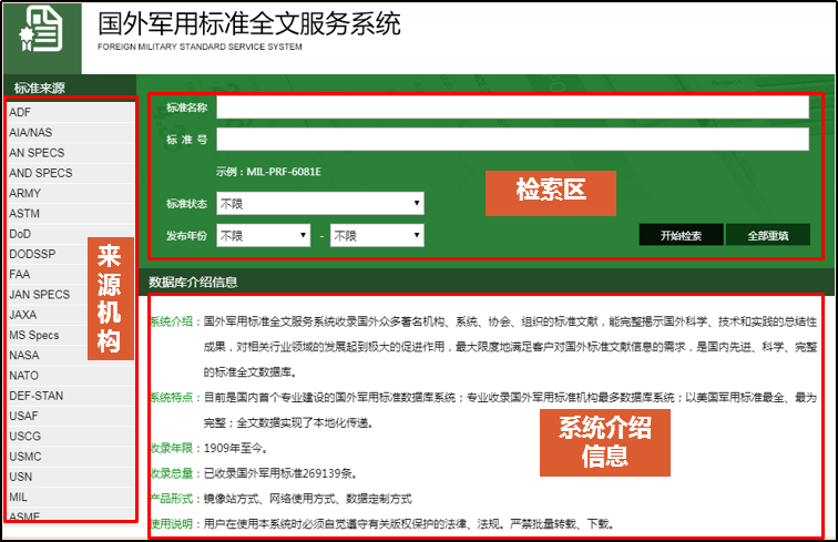 《国外军用标准全文服务系统》主要收录国内外著名军事机构、系统、协会、行业的军用标准及航空类标准,其中以美国军用标准数量最多,有着实用性、系统性、先进性、可靠性、详尽性等特点,是生产、科研、验收等环节重要的参考文献资源。美国国防部为了加强对军事工程设计、研制、维修和军用物资的采购、供应管理,在标准化方面做了大量的工作,它所制订的规范和标准主要有:军用规范(MIL-SPEC)、军用标准(MIL-STD)、军用手册(MIL-HDBK)等,在国际上深受广大科研工作者的青睐。航空类标准有美国航空航天工业联合会(AIA/NAS)、美国联邦航空管理局(FAA)、美国国家航空航天局(NASA)、日本宇宙航空研究开发机构(JAXA)等标准文献。