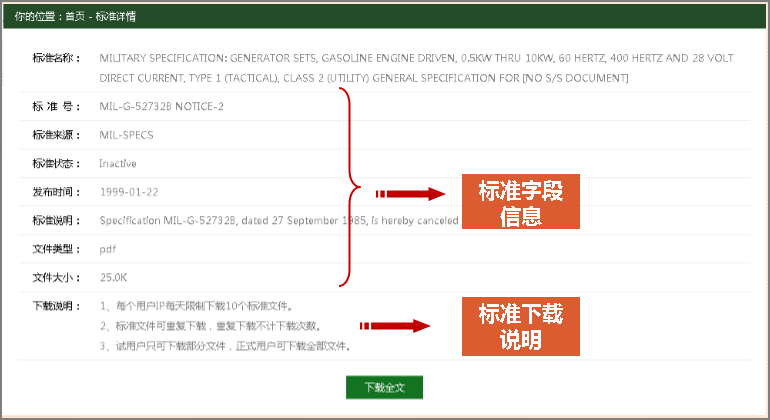 4. 点击检索结果,查看标准详细信息,并可进行标准下载。