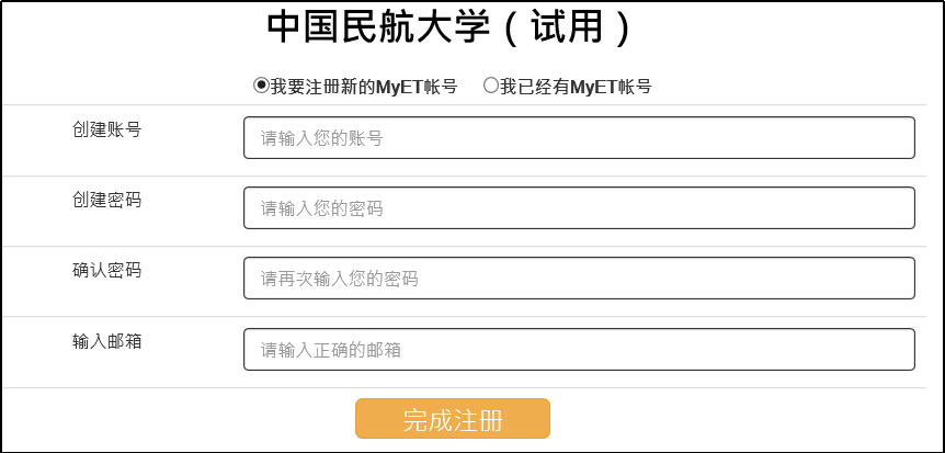 1. 校园IP地址范围内点击注册页http://cn.myet.com/MyETRegistration/SchoolRegistration.aspx?GateID=cauc_edu_cn注册MyET账号及密码。