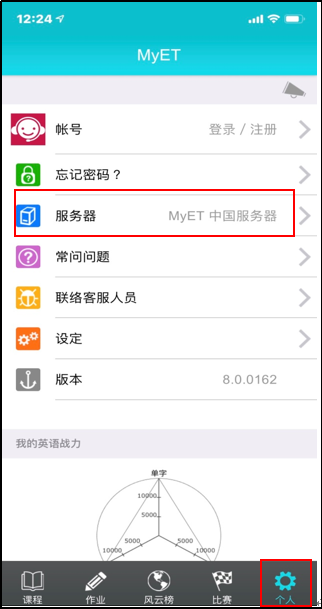 3. 开启MyET APP后,于最下方菜单中点击“个人”页签,在"服务器"的栏位选择“MyET中国服务器“(PC端默认使用“MyET中国服务器”,无须设置)。使用注册页注册完成的账号及密码登录MyET,开始使用课程学习。