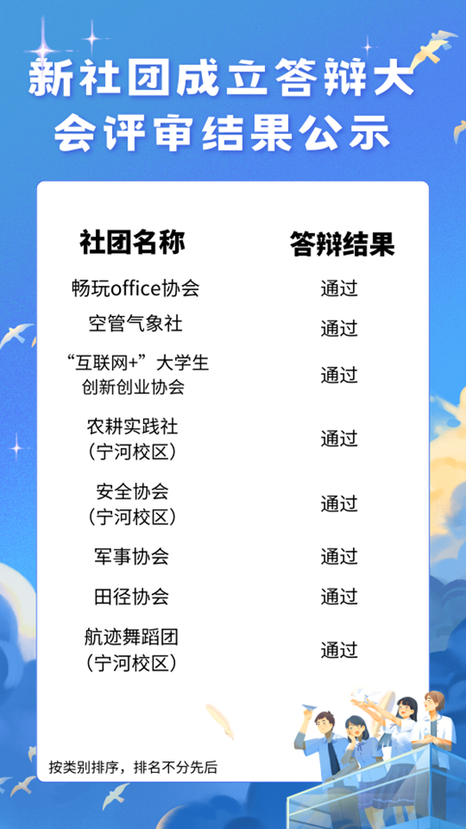 各社团代表在展示过程中自信大方,认真诚挚,从多方面展示了各自社团的创设理念、社团活动内容和未来发展规划,并从容应答评委提出的问题。经评委仔细商议后,共有8个社团通过答辩,现将评审结果公布如下。