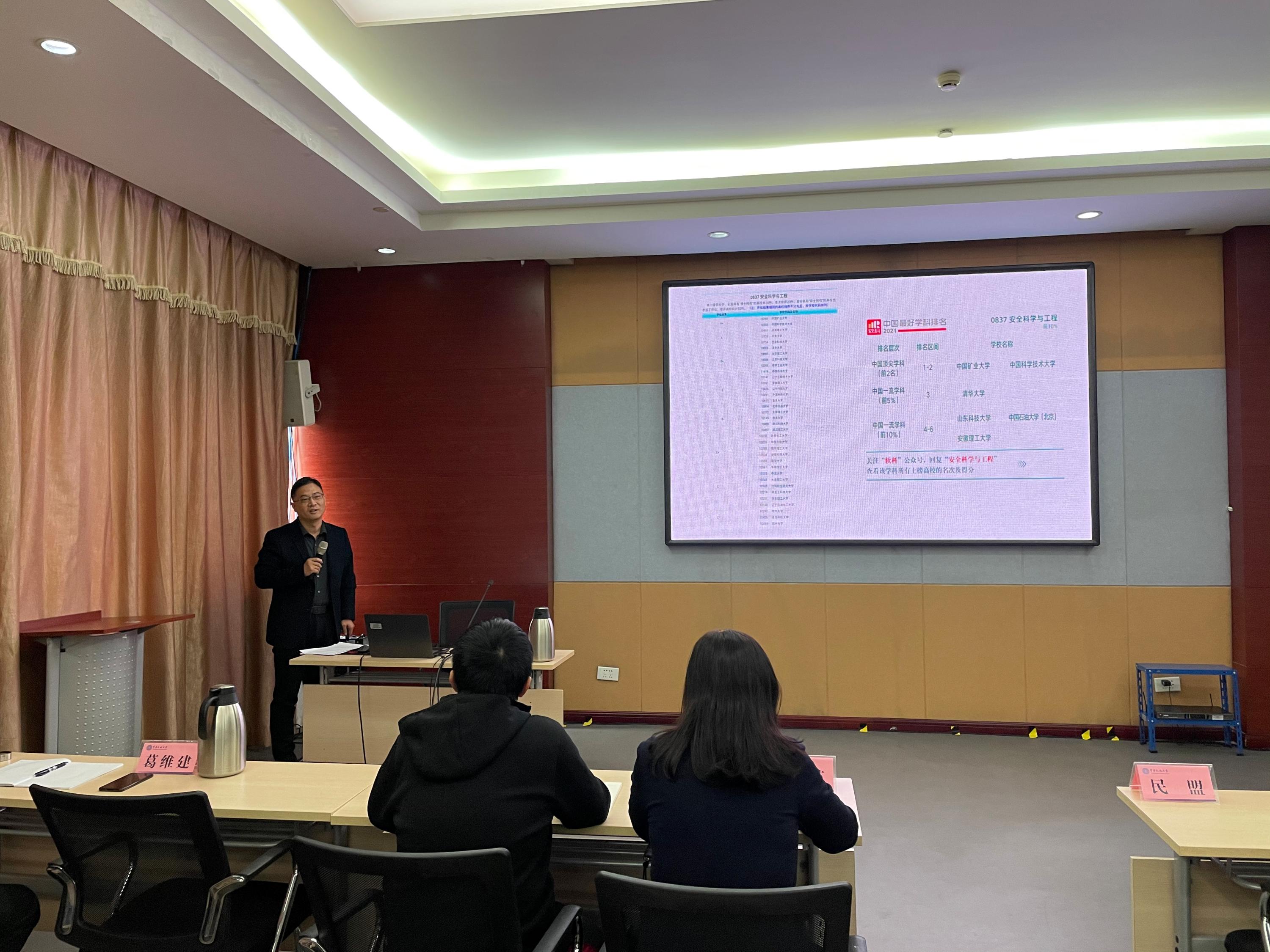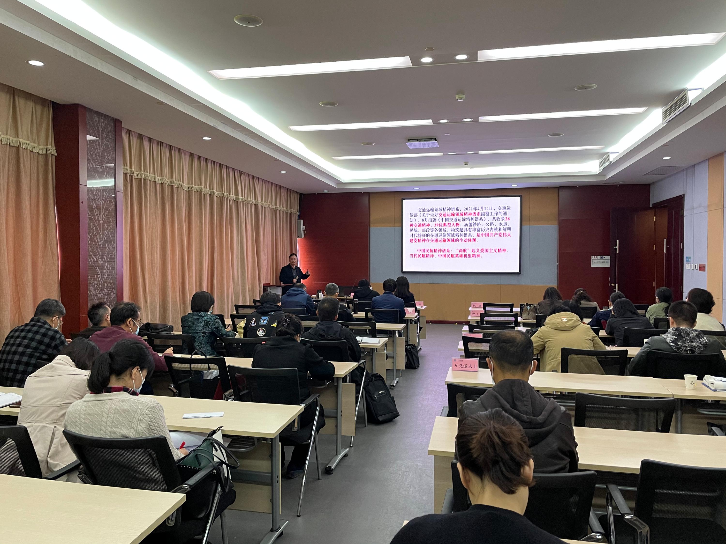 党委宣传部常务副部长朱瑞新老师为大家做了题为《凝聚磅礴精神力量 建设世界一流大学——学习贯彻中国民航大学精神谱系》的讲座。讲座中,朱部长首先从哲学角度回答了党史学习教育“为何学”、“谁来学”、“学什么”等问题,然后结合中国民航发展历程、我校校史和学校“十四五”规划目标,详细讲解了什么是精神谱系、我校精神谱系的形成背景以及我校的办学初心、家国情怀、校训精神和办学特色。