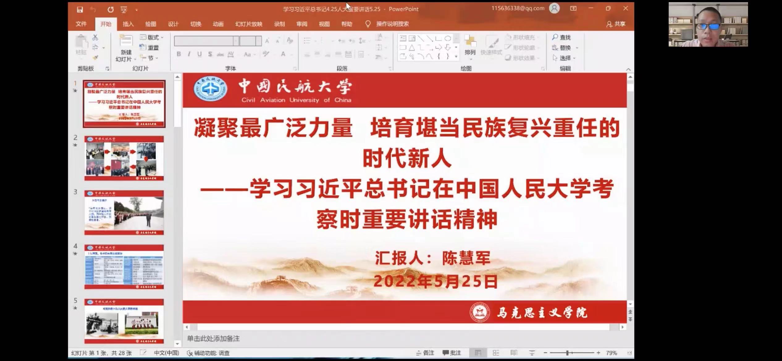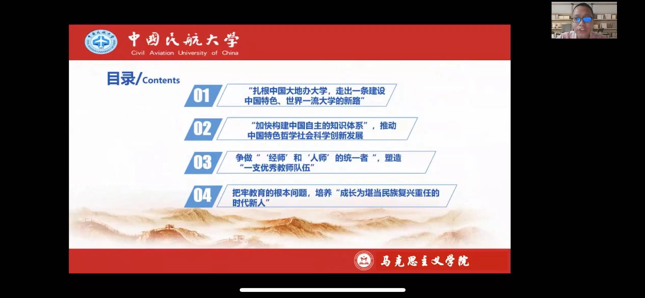 会议采取线上方式进行,特邀马克思主义学院陈慧军老师做主题讲座。陈老师以《凝聚最广泛力量 培养堪当民族复兴重任的时代新人》为题,从“办什么学、如何办学”、“如何构建以及构建什么样的哲学社会科学”、“如何培养和塑造一支优秀的教师队伍”、“为谁培养人、培养什么人、怎样培养人”四个方面深入阐释了习近平总书记在中国人民大学考察调研时重要讲话的重大意义和精神实质。讲座内容丰富,条理清晰,为党外人士学习和把握习总书记重要讲话精神提供了科学的方法和独到的视角。