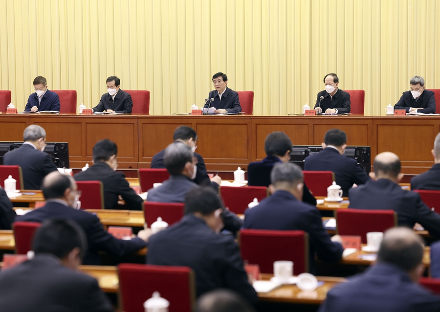 中共中央政治局委员、中央统战部部长石泰峰主持会议并讲话,强调要坚持以习近平新时代中国特色社会主义思想为指导,全面贯彻落实党的二十大精神,深刻领悟“两个确立”的决定性意义,增强“四个意识”、坚定“四个自信”、做到“两个维护”,认真学习贯彻习近平总书记关于做好新时代党的统一战线工作的重要思想,着力抓好中央统战工作会议精神和党中央关于统战工作各项决策部署的贯彻落实,着力解决统战工作重点难点问题,着力防范化解统战领域重大风险隐患,推动统战工作高质量发展,巩固和发展最广泛的爱国统一战线,为全面建设社会主义现代化国家、全面推进中华民族伟大复兴凝聚人心、汇聚力量。