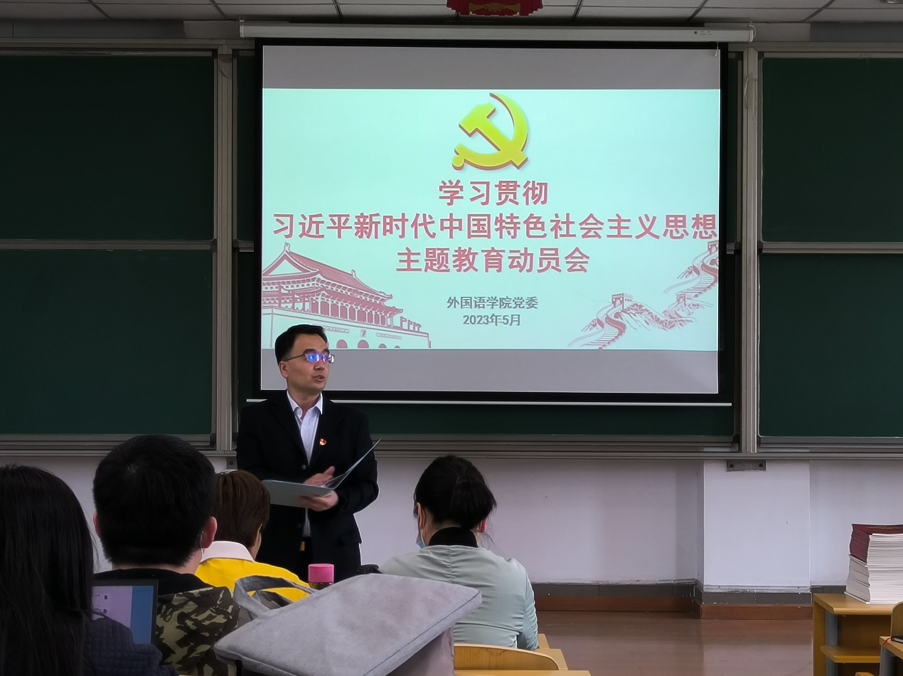 5月5日下午,外国语学院党委在南教二-208教室召开学习贯彻习近平新时代中国特色社会主义思想主题教育动员会。学院领导和全体党员参加会议,学院党委书记主持会议。