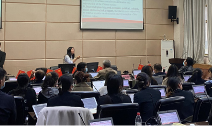 国际处和卓越学院党支部袁桦同志,以及大学英语二部党支部鄢佳同志分别以二十大报告和政府工作报告为例,为大家讲解外宣翻译心得。袁老师提到,要实现“语义的显化”不仅需要把握中英双语的差异,关注时事政治,了解国家政策方针,更需要具备查证的意识与能力;鄢老师将做外宣翻译的体会精辟总结为三点,即“推敲之慎:山外有山”、“联通虚实:隐与不隐”以及“弦外之音:翻译中思考的乐趣”。在场师生党员聆听分享,认真记录。
