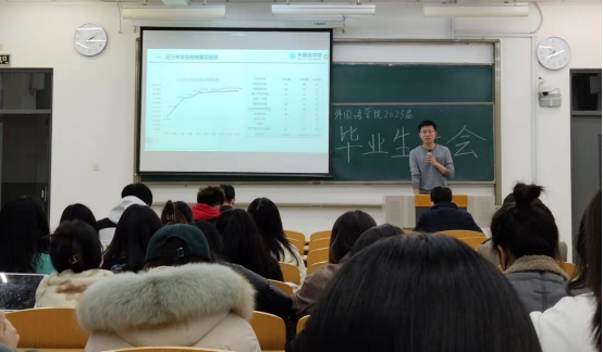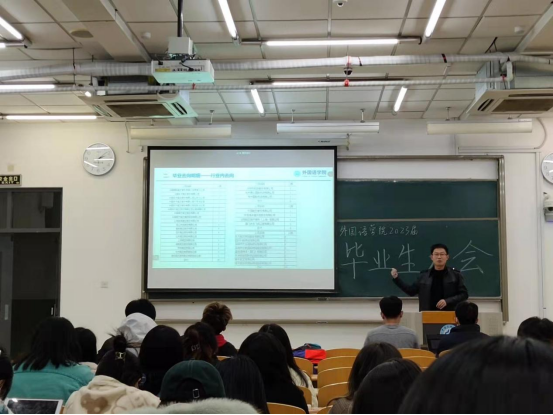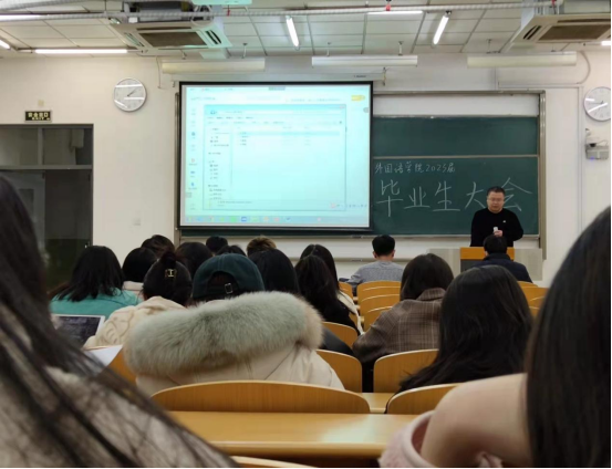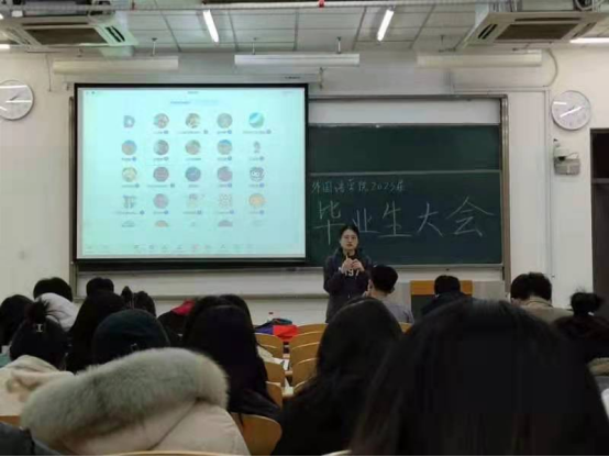 为推动2023届毕业生毕业、就业工作稳步前进,外国语学院围绕学业、毕业和就业三大主题,组织召开了毕业生大会,帮助同学们树立方向、端正态度、确定目标。院党委副书记魏伟、英语系主任刘晓峰,2019级辅导员丁超及2023届全体毕业生参加会议。
