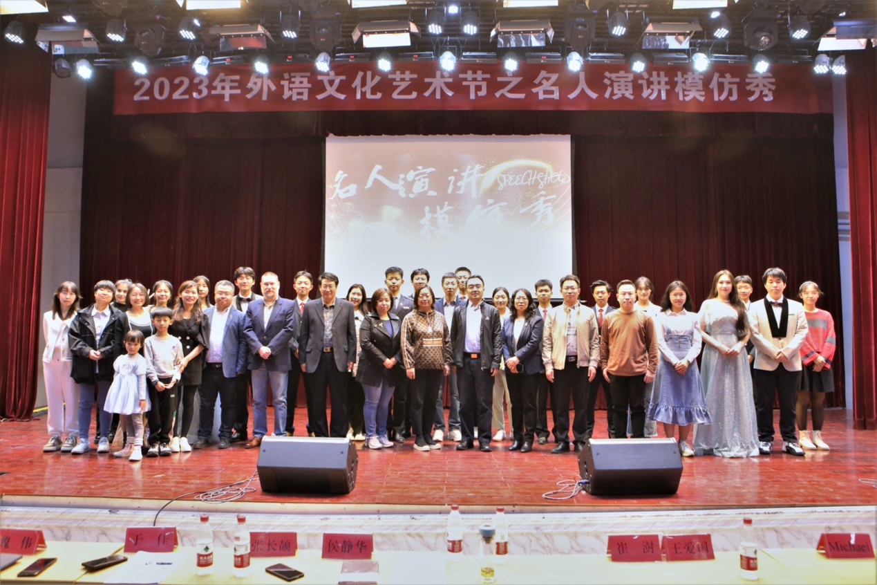 2023年4月2日,外国语学院在至善苑104主办“2023年外语文化艺术节之名人演讲模仿秀”活动。外语文化艺术节是外国语学院发起,并面向全校各级同学举办的系列活动。此次活动口号为“聆听名人演讲,体会语言魅力,感受思想碰撞。”参与本次活动的嘉宾有外国语学院党委书记慕永锋、外国语副院长侯静华、外国语学院党委副书记魏伟以及外国语学院王爱国教授、崔澍教授、张长颉副教授、于佳副教授、刘晓峰老师、外教Michael和英语原著课程组所有教师,活动观众报名人数逾600人,有来自各个学院的近400名学生观众现场聆听。在这个鸟语花香的时节,我们打开心灵的窗口,参与了一场听名人演讲、学名人演讲、仿名人演讲的盛宴。精彩的演讲,活力的歌舞,专业的点评,充分展示了本次活动的独特风采。