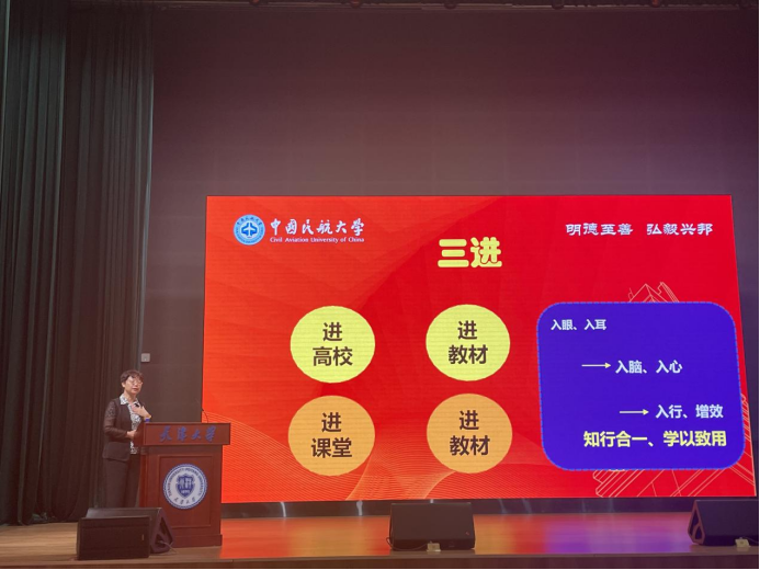 7月7日,在天津市教委主办的“2023年天津高校外语教育高质量发展论坛暨‘理解当代中国’系列课程教学研讨”上,张艳玲院长做了题为《推动习近平新时代中国特色社会主义思想入脑入心——多维度推进“三进”工作之中航大实践》的大会发言。发言中,张院长从组织部署、配套保障、教材选用和课程建设等方面介绍了我校推进《理解当代中国》教材落地工作的实施情况,并以“中国民航运行政策国际推广”、“航空术语规范化”和“教育部航空英语课程虚拟教研室”为案例,分享了我校在贯彻落实“三进”工作中的创新实践,生动展示了交通强国背景下航空类外语课程建设和人才培养的实现路径,受到与会专家和学者的高度评价。