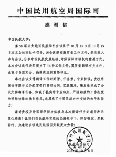 近日,中国民航大学收到了民航局国际司的感谢信,对学校及外国语学院全体参与第58届亚太地区民航局长会议文件翻译任务的老师表示衷心感谢。